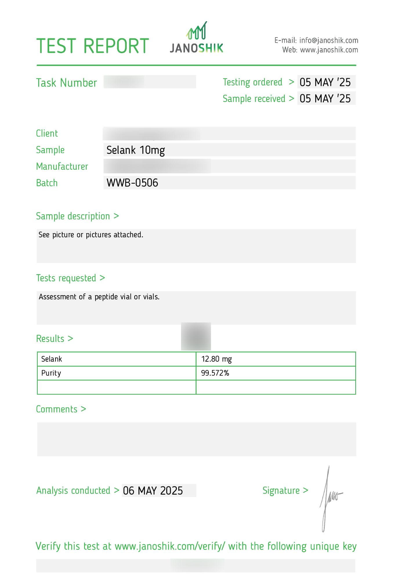 Chaque lot de peptide Selank est rigoureusement testé pour sa pureté et sa stérilité. Nous fournissons uniquement des peptides de laboratoire avec une pureté de 99 %, contrôlée par un organisme de test indépendant. Le rapport de test correspondant (COA) est disponible avec les images du produit, vous assurant des résultats de recherche fiables.